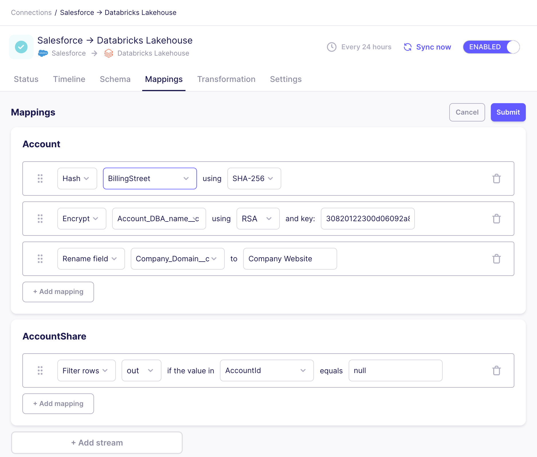 We introduced mappings in the API in version 1.3, and it's now available in Airbyte's user interface, too. Use mappings to hash, encrypt, and rename fields, and filter rows. You set up mappings on each stream, ensuring your source data arrives in your destination in a more meaningful way. Learn more >